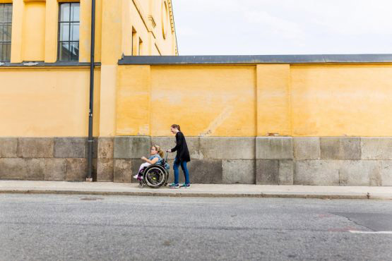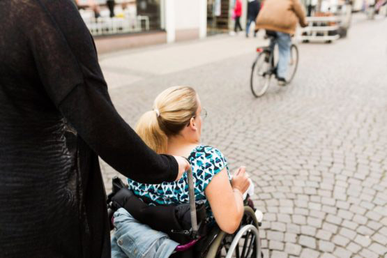 Assistant helping disabled woman in wheelchair move around city
