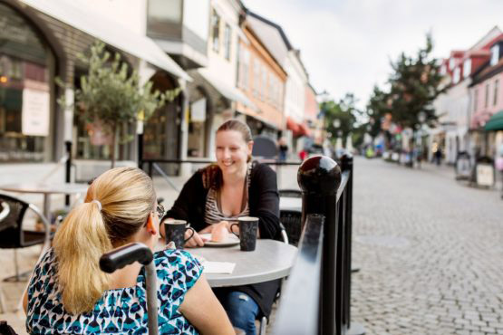 Woman with disability and her assistant talking in sidewalk cafe
