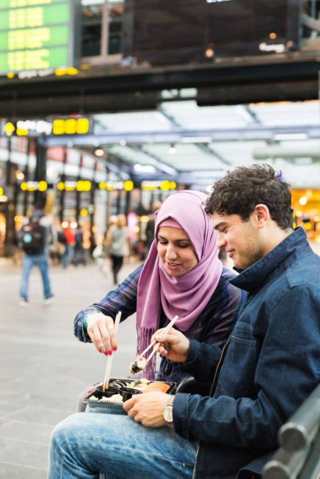 Friends having sushi at railroad station