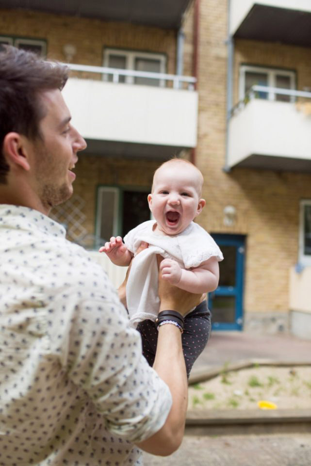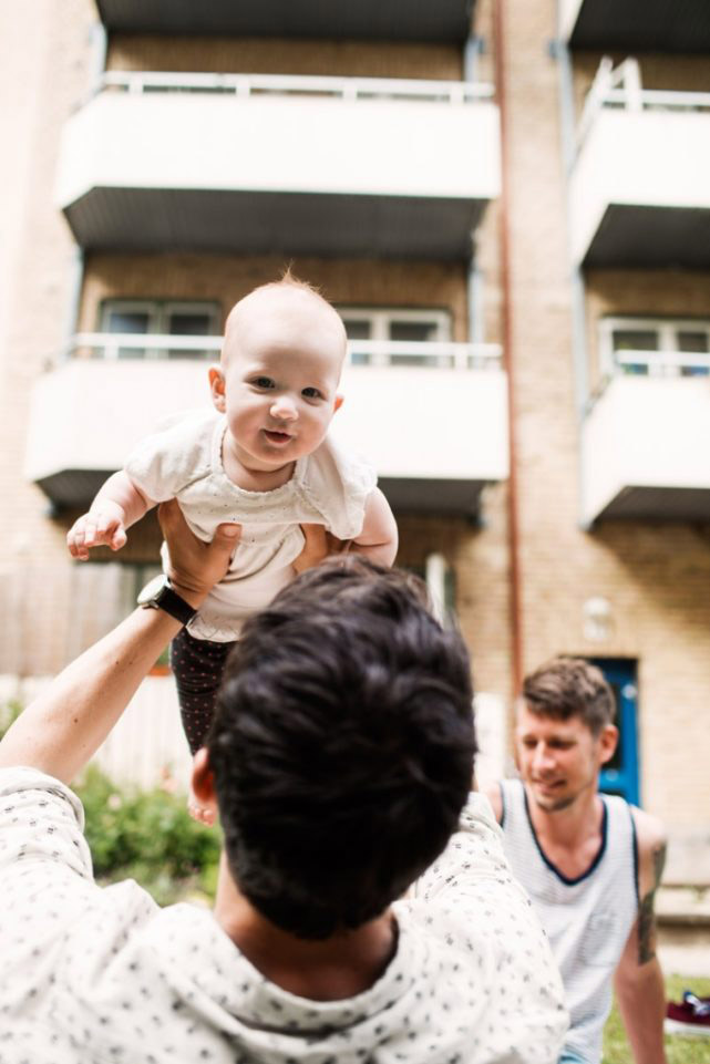 Gay men playing with baby girl at yard