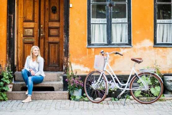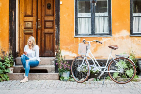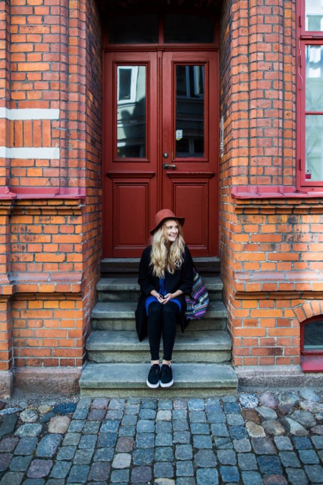 Young woman sitting on steps in front of closed door
