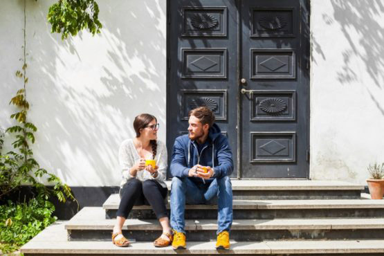 Young couple sitting on steps, holding coffee mug