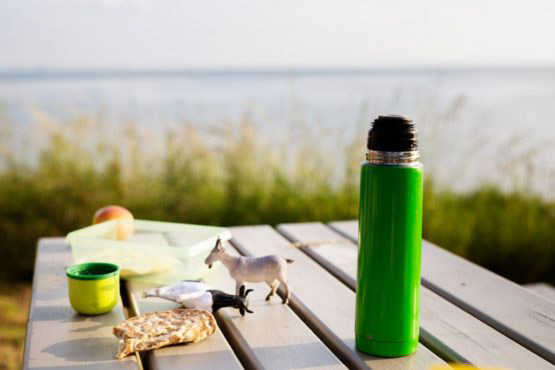 Insulated drink container and toys on picnic table