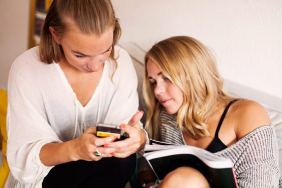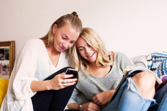 Two young women reading text message on smart phone