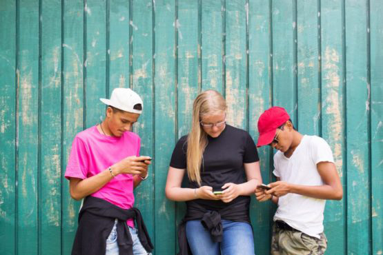 Teenage girl and teenage boys (14-15) using smart phones