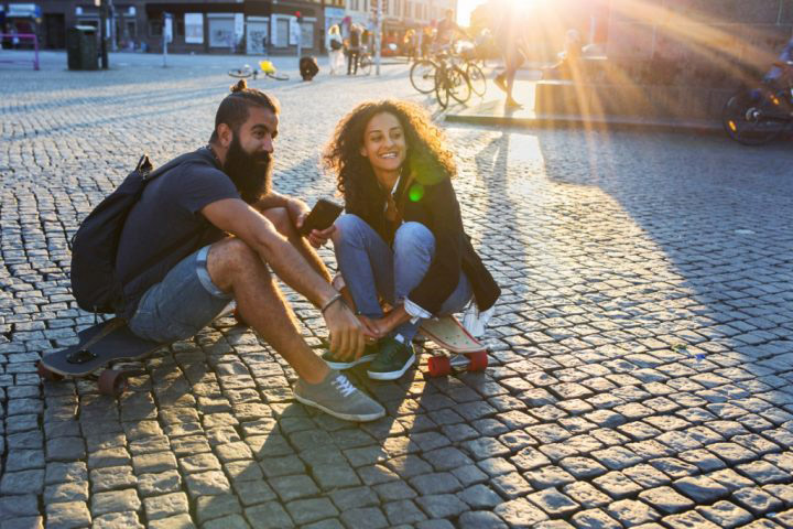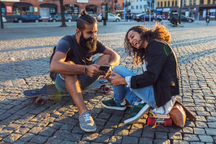Friends sitting on longboards and using smartphone in city