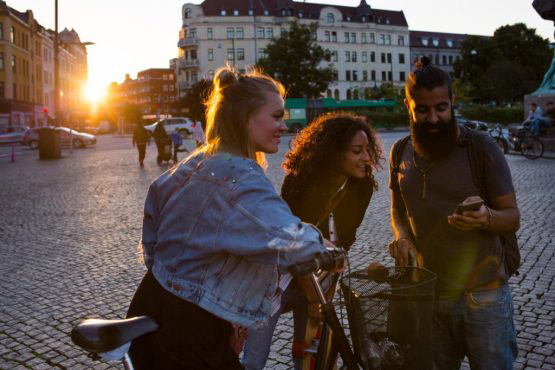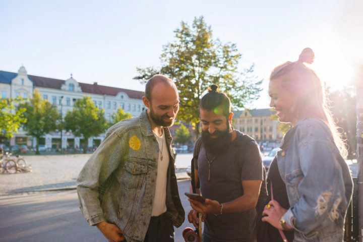 Three friends looking at smartphone