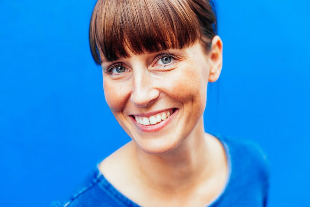 30-34 Years, Bangs, Beautiful Woman, Blue, Blue Background, Brown Hair, Close-Up, Color Image, Confidence, Dublin – Republic Of Ireland, Front View, Happiness, Headshot, Horizontal, Human...
