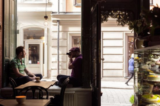 Horizontal, Indoors, Day, Standing, Casual, Smiling, Two People, 20-24 Years, Young Women, Mid Adult Men, Service, Buying, Customer, Small Business, Indulgence, Serving, Sweden, Stockholm, Gamla...