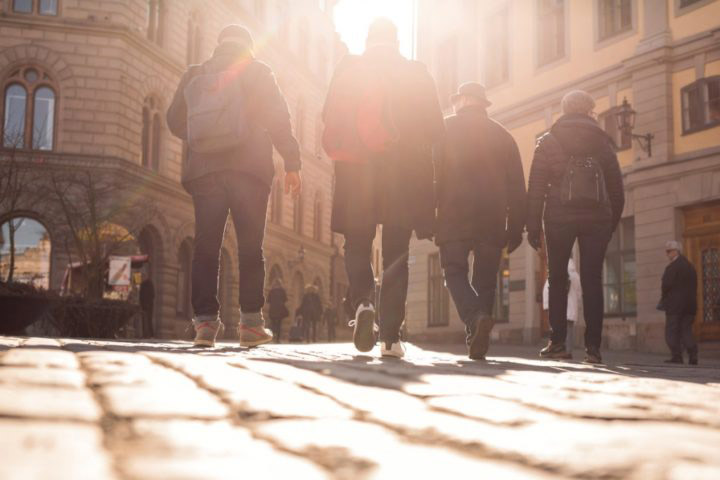 Horizontal, Outdoors, Day, Rear View, Full Length, Surface Level, Lens Flare, Walking, Casual, Jacket, Four People, 35-39 Years, People In The Background, Women, Mid Adult...
