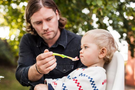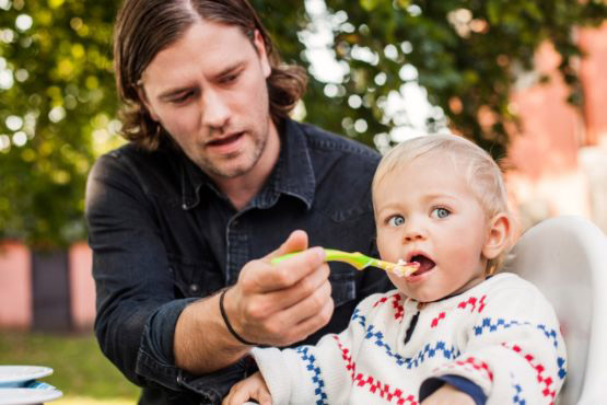 12-17 Months, 25-29 Years, Baby Girls, Babyhood, Bonding, Breakfast, Care, Casual Clothing, Color Image, Daughter, Day, Eating, Family, Family With One Child, Father, Feeding, Focus...