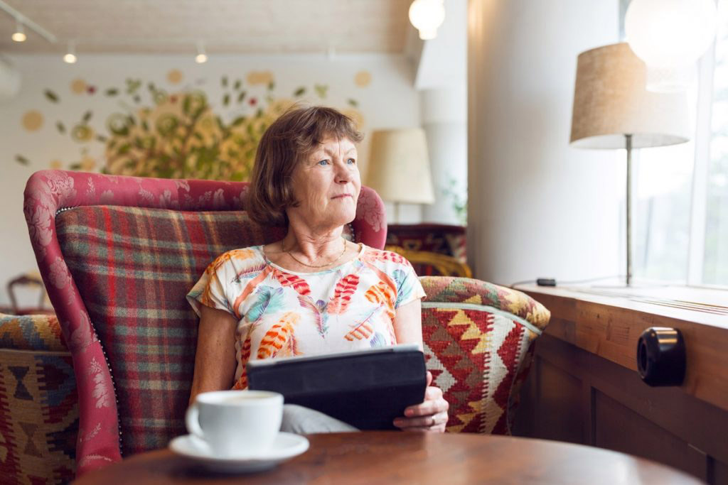 Horizontal,Indoors,Day,Looking Down,Three Quarter Length,Selective Focus,Side By Side,Sitting,Smiling,Two People,60-64 Years,Only Senior Women,Caucasian Ethnicity,Meeting,Wireless Technology,Using Computer,Digital Tablet,Table,Sofa,Drink,Mug,Coffee Cup,Cafe,Cheerful,Elegance,Togetherness,70-79 Years,Comfortable,Sharing,Cake,Food And Drink,Coffee Break,Leisure Activity