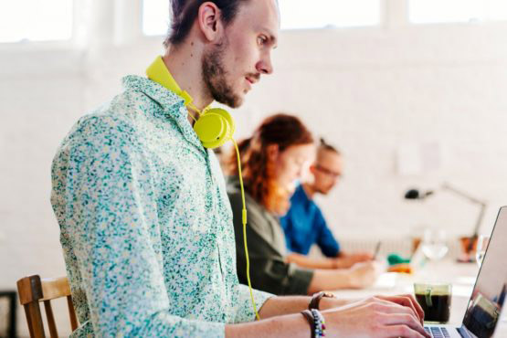 Young businessman using laptop with colleagues working in background at creative office