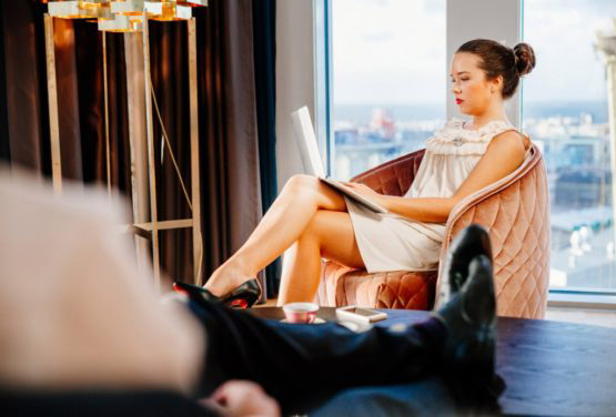 Side view of businessman leaning on sofa by window at hotel room
