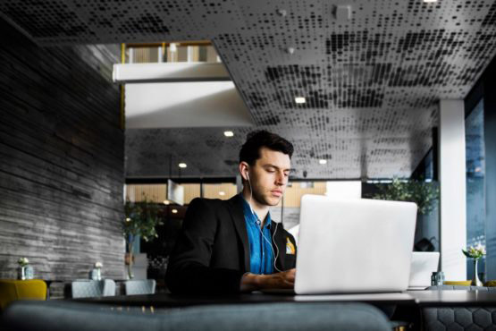 Businessman using laptop while sitting at restaurant