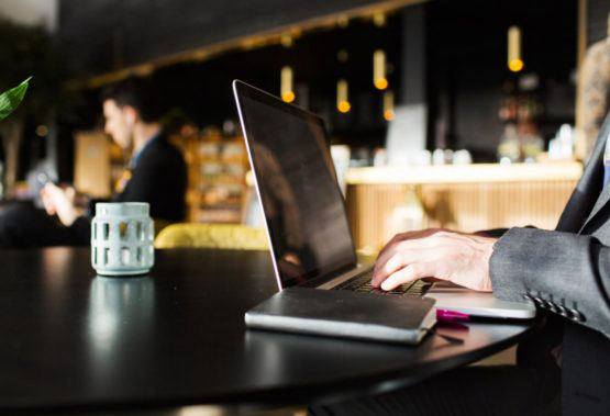 Close-up of man typing on laptop while sitting at restaurant