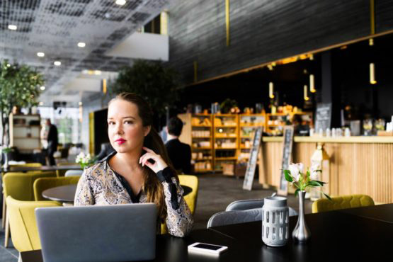 Thoughtful businesswoman sitting at table with laptop in restaurant
