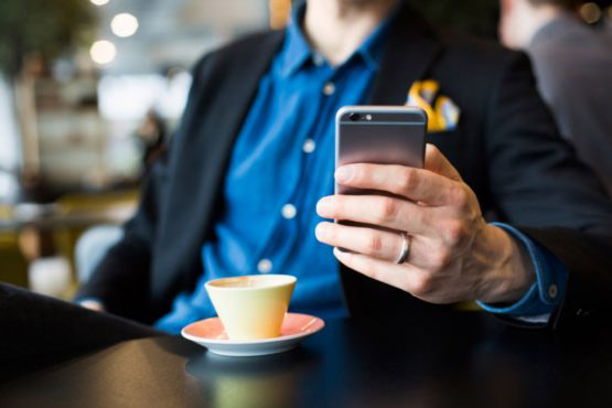 Businessman holding smart phone drinking coffee at restaurant