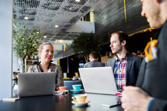 Businessmen sitting at tables in restaurant
