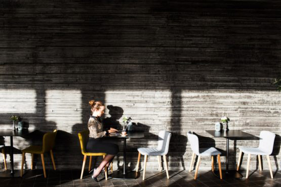 Confident businesswoman sitting at table with laptop in restaurant