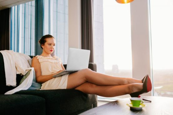 Classy businesswoman using laptop while sitting on sofa at hotel room