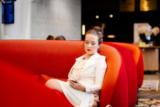 Businesswoman holding smart phone while sitting on red sofa at hotel